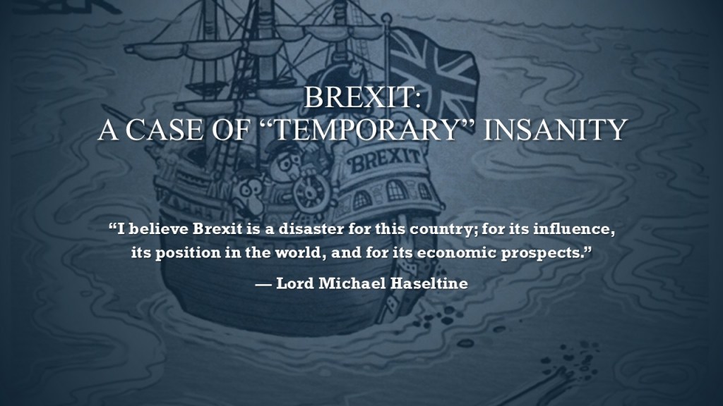 This post visits Brexit and reflects on this moment of “temporary” insanity, a deeply disappointing moment, not only for Britain, but also for the European Union. Brexit is like drinking cheap alcohol, first it make you drunk, then ik blinds you to destroy your house. As Lord Michael Haseltine noted, “I believe Brexit is a disaster for this country; for its influence, its position in the world, and for its economic prospects,”