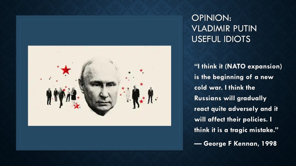 In conclusion, while acknowledging the complexities of the Ukraine crisis, and the diverse range of opinions and motivations that shape them, the use of the term “Putin’s useful idiots” is futile, potentially dismissing legitimate criticisms or differing perspectives on Western policies and strategies. However, the imperative remains to navigate these intricate issues with sobriety and discernment, seeking balanced solutions that prioritise peace, stability, and respect for international law.