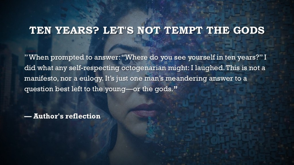 When prompted to answer, “Where do you see yourself in ten years?” I did what any self-respecting octogenarian might: I laughed. This is not a manifesto, nor a eulogy. It’s just one man’s meandering answer to a question best left to the young—or the gods.