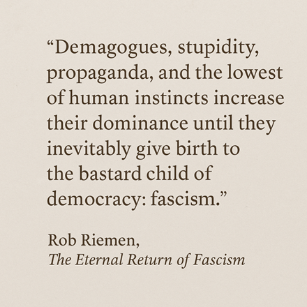 Riemen does not equivocate. For him, the bastard child of democratic decay is always fascism. He warns that: