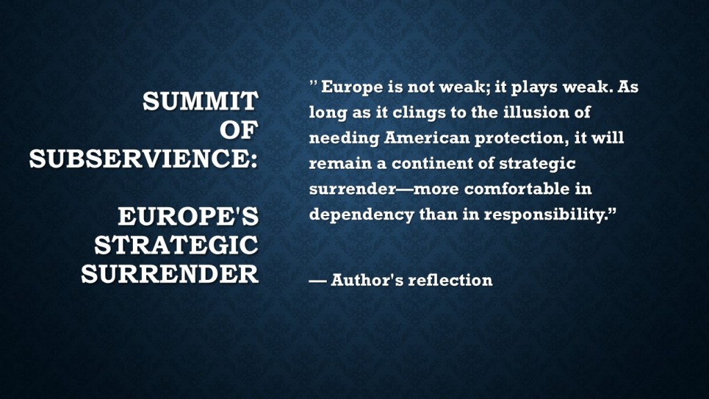 ✍️Authors Note: As a long-time supporter of European integration and a realist observer of geopolitics, I have lived through many of Europe’s turning points. But I have grown wary of today’s inflated rhetoric, historical amnesia, and the cyclical seductions of military spending. I have watched the events surrounding the recent NATO and EU summits with both dismay and clarity and question whether the current trajectory of European defence policy—and Europe’s subservience toward the United States—truly serves our best interests. This reflection is not a rejection of European unity, but a call for coherence, historical honesty, and strategic maturity.