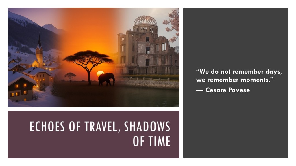 As the years advance, so too does my understanding of what these travels gave me—not souvenirs or stories, but moments that echo still. Travel, like life, unfolds its meaning slowly. What once dazzled now invites reflection; what once passed quickly now lingers. And somewhere in the hush of the African bush or beneath the shadow of Hiroshima’s dome, I’ve come to see that it is not the destination, but the remembering, that stays with us.