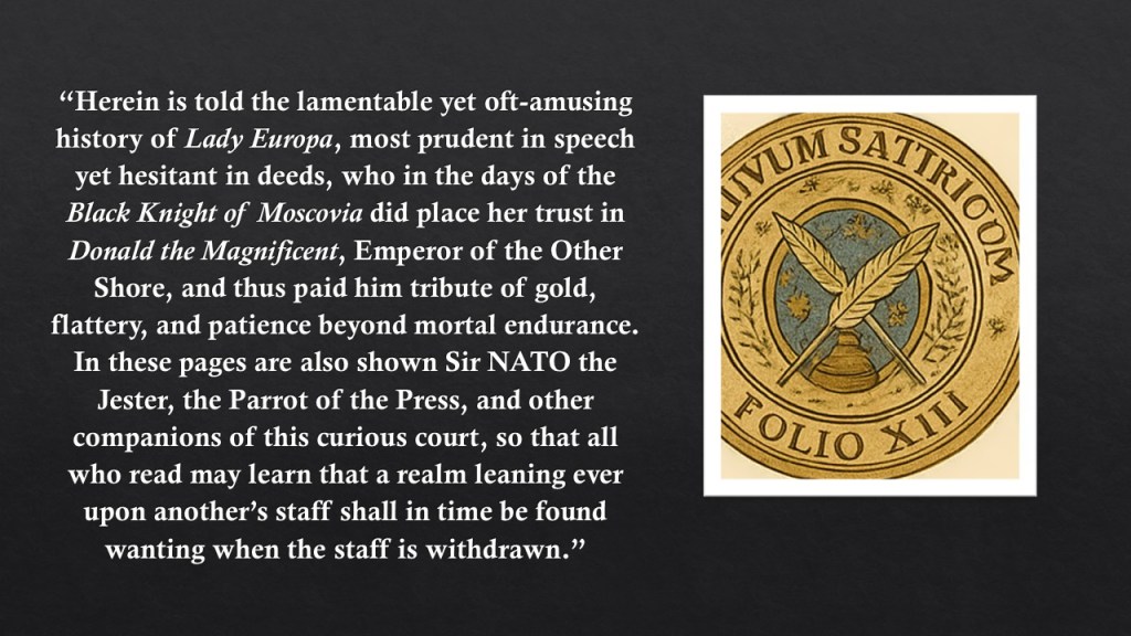 A forgotten manuscript from the Abbey of Perpetual Delay by the elusive Brother Inconvenience reveals the tale of Lady Europe, a timid princess; Donald the Magnificent, an emperor in gold-painted armour; and the Black Knight of Moscovia. Satire disguised as medieval chronicle โ or history repeating itself in rhyme?