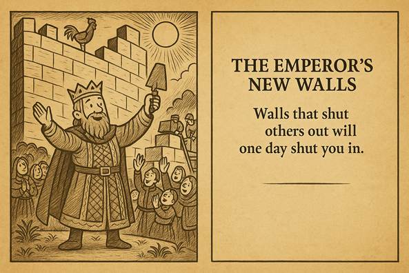 A proud Emperor builds walls so tall even the sun cannot climb them. He cries “fake news” at every complaint, calls strangers criminals, and cages their children — until the walls keep his people inside as surely as they keep others out.
