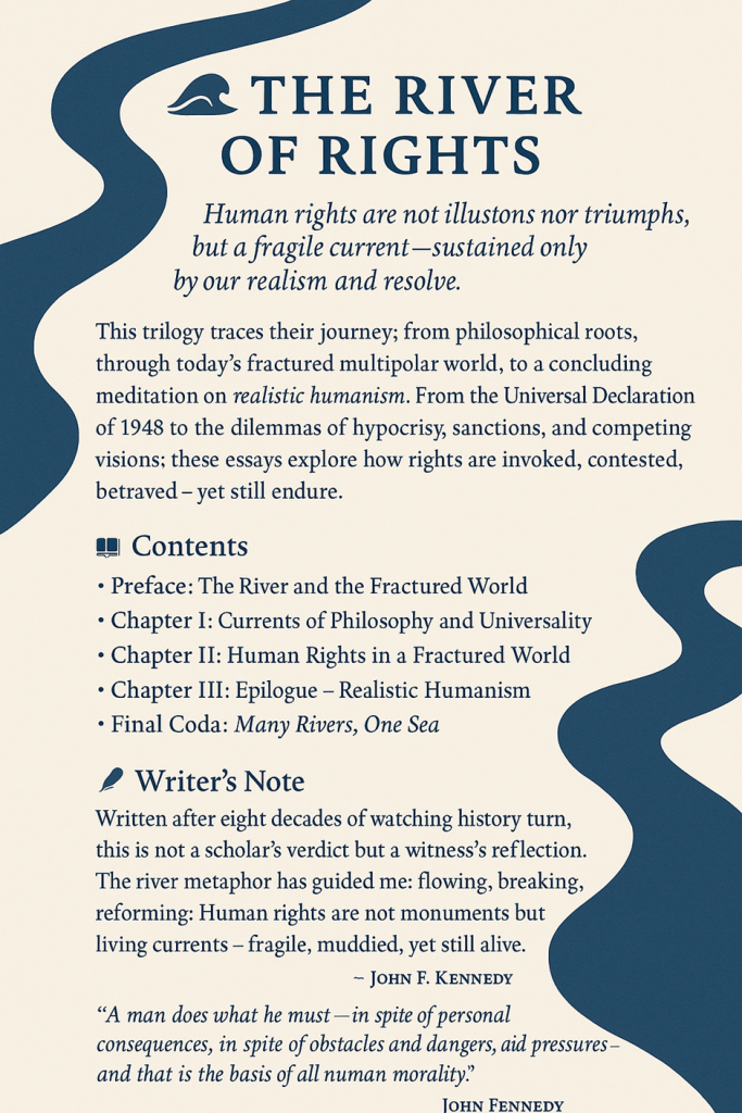 This trilogy grew out of a lifetime of reflection on human rights: their philosophical origins, their turbulent present, and their fragile endurance. I write not as a scholar offering definitive answers, but as someone who has lived through eight decades of history and wishes to bear witness. The metaphor of the river has guided me — flowing, breaking, reforming — a reminder that human rights are not monuments carved in stone, but living currents.